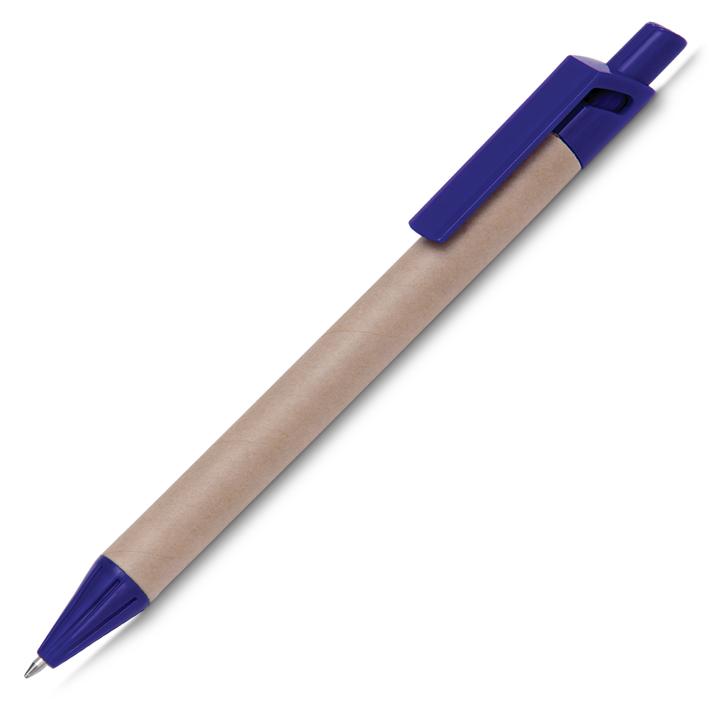 Caneta de papelão com clip de plástico ecológica. Esferográfica retrátil. Acionada por clique. Escrita em azul.