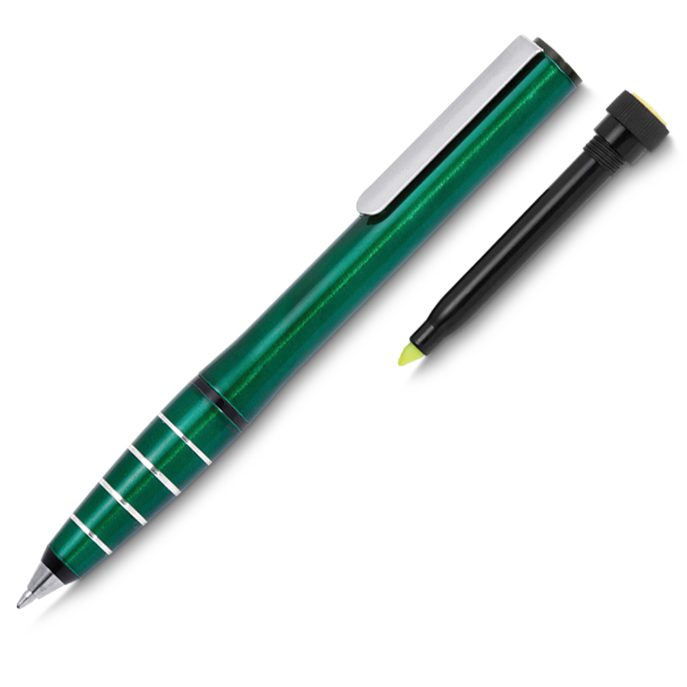 Caneta de metal c/ marca texto e clip aredondado, corpo colorido com detalhes em prata e preto. Clip metal prata, possui um marca texto na ponta superior em preto com detalhe amarelo, basta rotacionar para utilizar o marca texto. Possui um anel inferior preto e abaixo quatro anéis prata. Aciona por giro. Escrita azul.