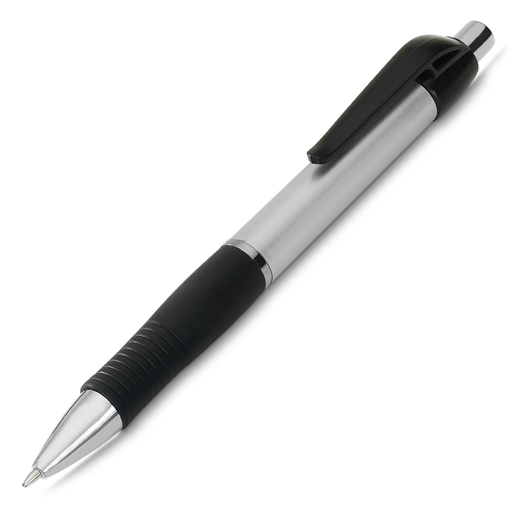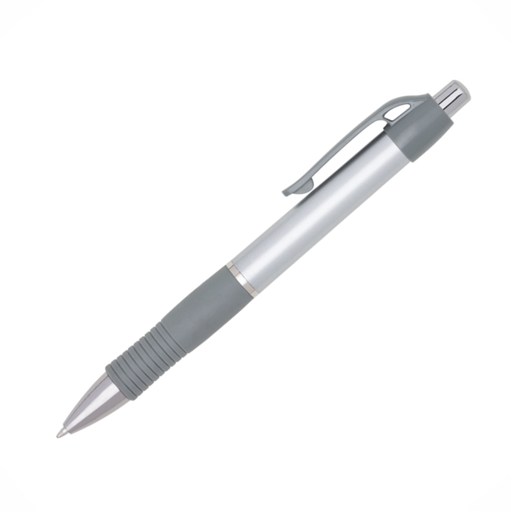 Caneta de Plástico Metalizada c/ Borracha e Anel. Possui clip plástico colorido, possui anel central prata e parte inferior emborrachada colorida com relevo .