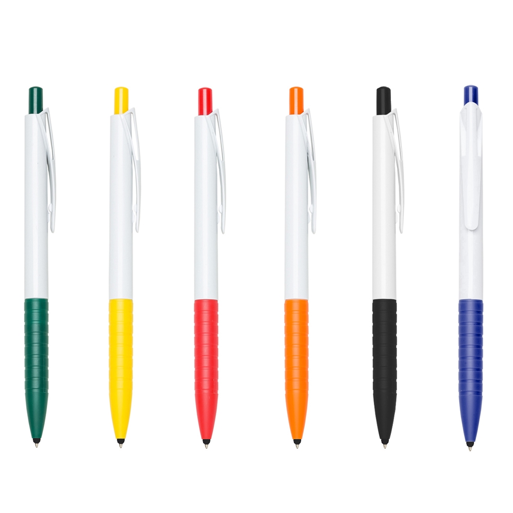 Caneta plástica touch de corpo branco com detalhes coloridos.