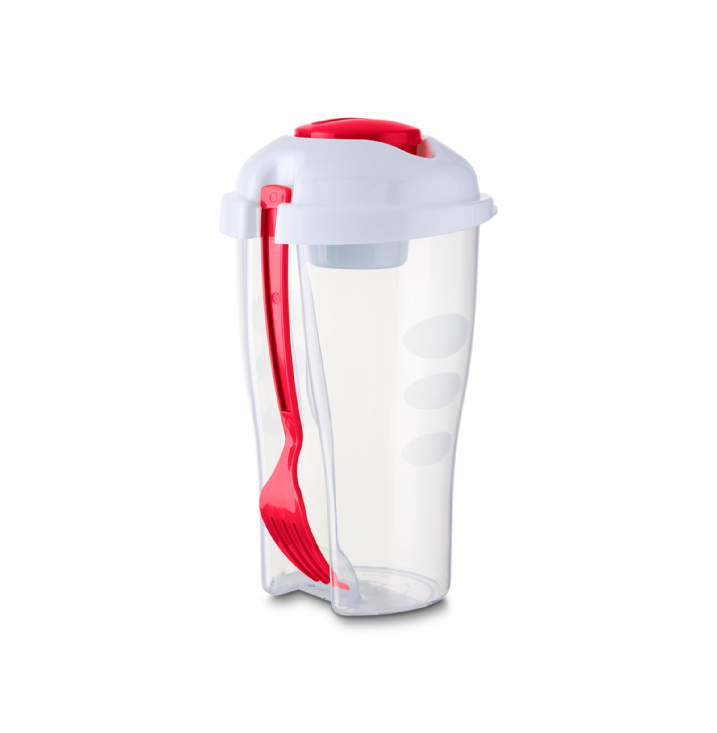 Copo de salada 850ml com garfo e compartimento para molho. Copo plástico transparente com três detalhes ovais na lateral e tampa branca, no centro da tampa há um compartimento(mini copo com tampa) de 50ml para colocar molho e garfo plástico encaixado na parte traseira da tampa.