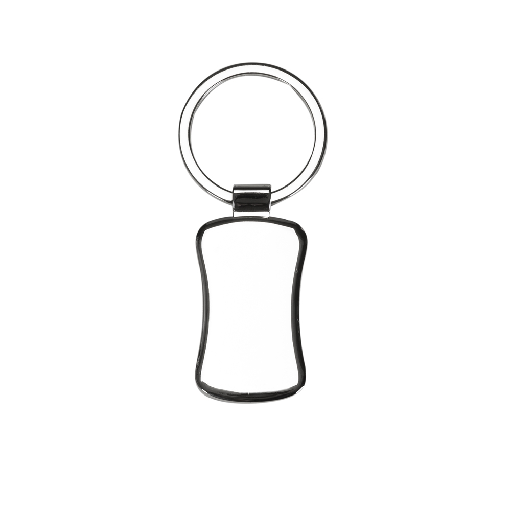 Chaveiro de metal retangular com chapa central, verso liso. Possui bordas arredondadas e laterais encurvadas.