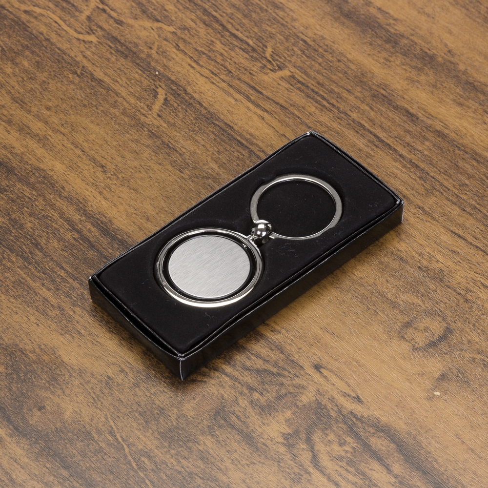 Chaveiro metal giratório redondo. Possui suporte redondo também giratório que segura o chaveiro, chapa redonda giratória ambos lados iguais e com contorno preto.