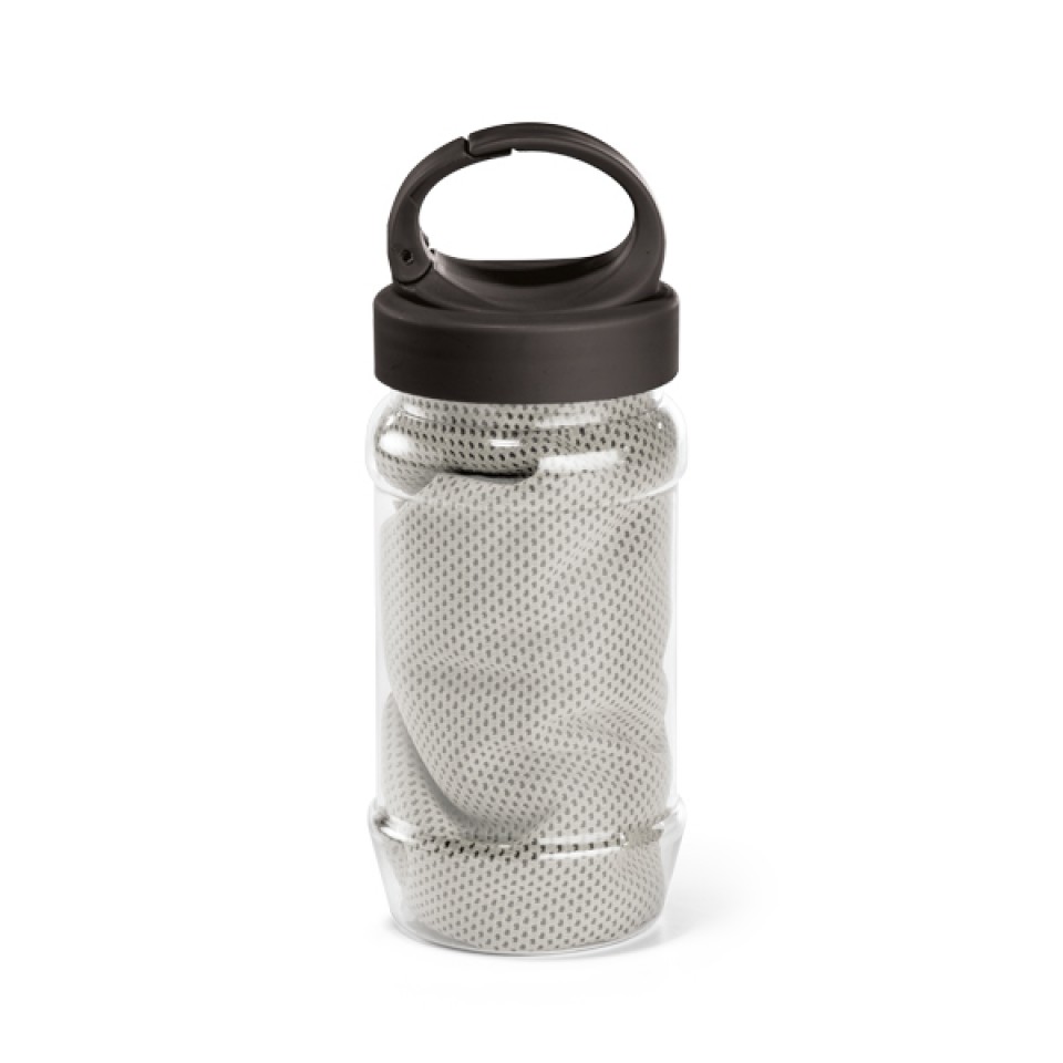 Toalha para esporte em poliamida e poliéster. Refrescante, quando molhada permanece fria durante horas. Se aquecer, basta balançar reativando sua frescura. Reutilizável e lavável. Acompanha garrafa plástica em PP e PET com mosquetão. Toalha tamanho 30x80Cm disponível nas cores: azul escuro, azul claro, verde, rosa e cinza claro.